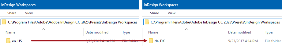 In both folders, there should only be a single folder with the language currently being used by InDesign. Rename this folder to the desired language using the Alpha 2 ISO standard shown in the bullet list above. For example, to view the menu items in Danish instead of English, change the folder names from en_US to da_DK as illustrated below.