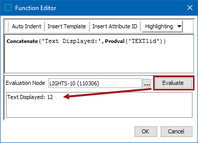 - Click the Evaluate button. The result appears in the bottom text box. In the following example, the result is 'Text Displayed: 12'