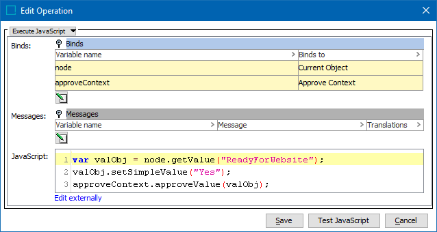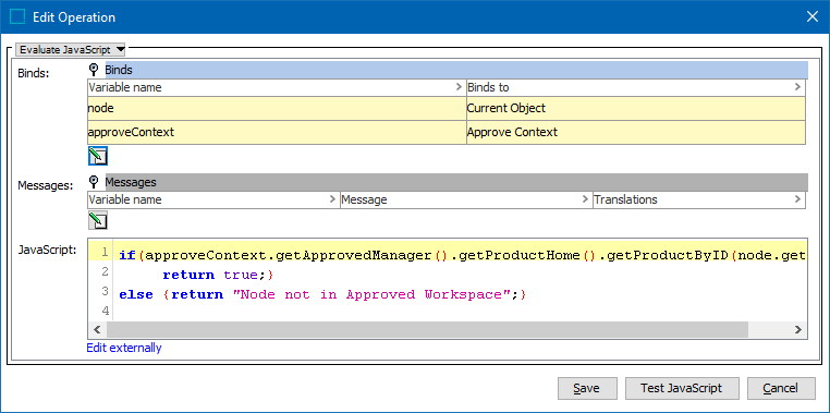 In the Edit Operation dialog, optionally add Messages, as defined in the Localized Messages for JavaScript Business Rules topic.