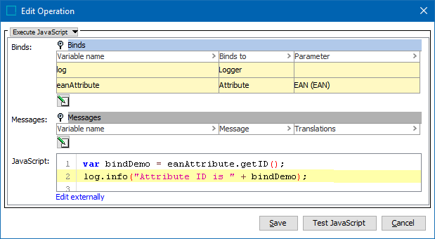 In this example, the Variable Name is 'eanAttribute', the Binds to field is Attribute, and the Parameters field displays the EAN attribute. The following JavaScript returns the ID of the EAN attribute as an Info log message: