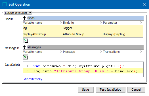 In this example, the Variable Name is 'displayAttrGroup', the Binds to field is Attribute Group, and the Parameters field shows the Display attribute. The following JavaScript returns the ID of the Display attribute group as an Info log message: