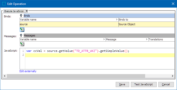 This sample code above expects a bind to the 'source' variable, gets the value of the 'TD_ATTR_WKZ' attribute on the source object, and stores it in the variable 'ccVal'.