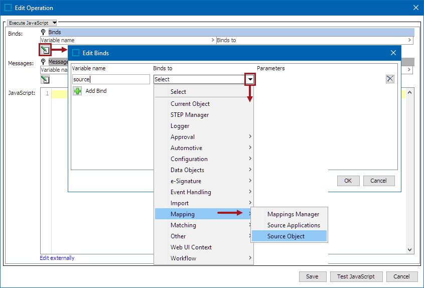 In the Edit Operation dialog, add JavaScript to call the bind.