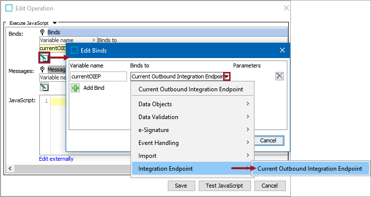 In the Edit Operation dialog, add JavaScript to call the bind.