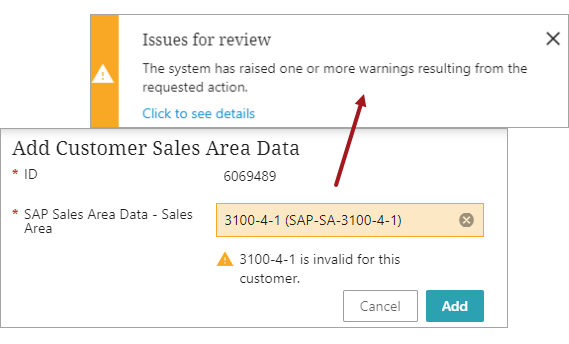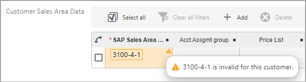 In another example, an invalid value (3100-4-1) is selected in the Create dialog of the Globally Configured Multi Edit Data Container, triggering a warning that states that ‘3100-4-1 is invalid for this customer’.