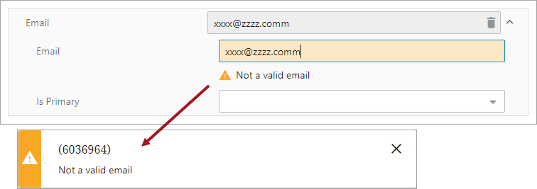 Below is an example of a Data Issues Report bind configured within the Globally Configured Unfolding Data Container. If you enter an invalid email address and click out of the field, a warning message near the field and a warning notification are displayed.