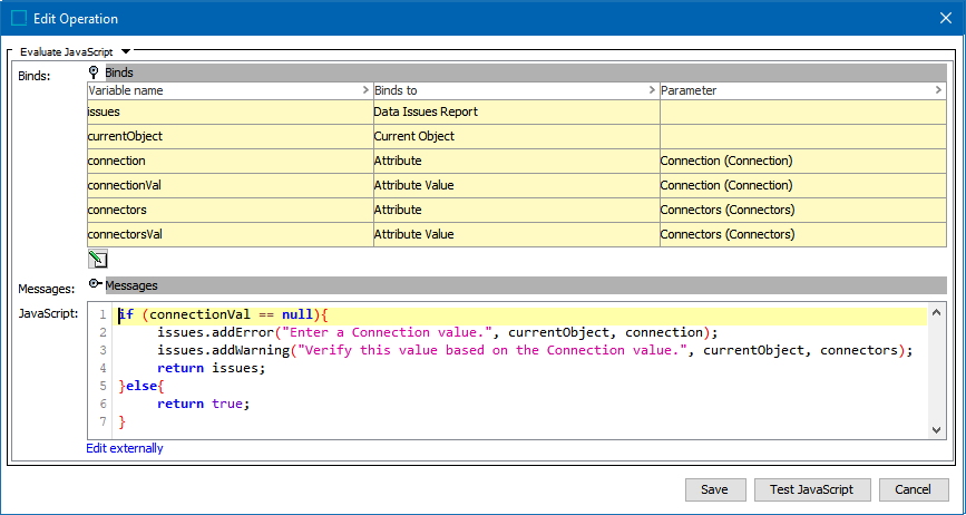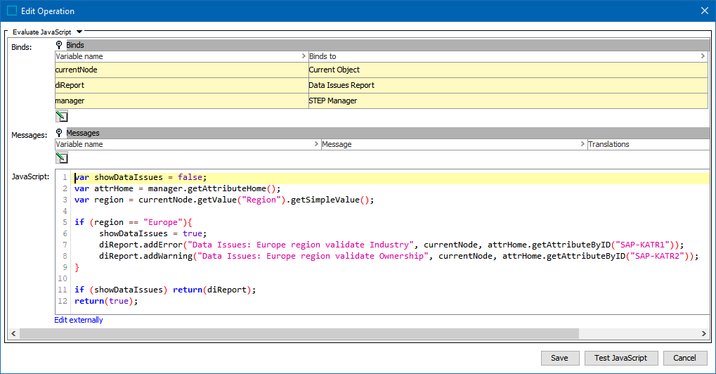 In the Edit Operation dialog, optionally add Messages, as defined in the Localized Messages for JavaScript Business Rules topic.