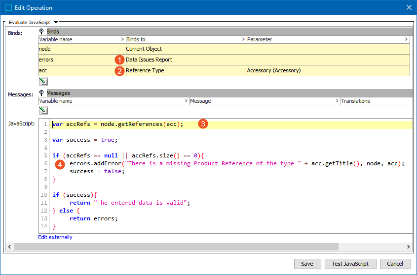 The JavaScript variable accRefs = node.getReferences(acc); uses the 'Accessory' reference type set in the 'acc' bind.