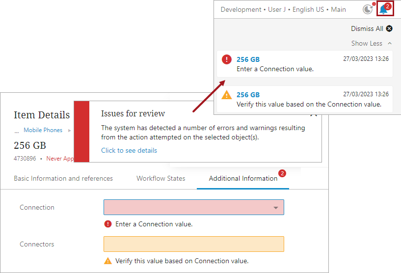 Important: When a business condition evaluates two or more data container instances, it is not possible to determine the order in which the condition evaluates them and displays warnings. For example, when adding a data issue to a data container instance that has the same value as another instance, it is uncertain whether the warning will be displayed on the first or second instance. Therefore, to avoid confusion, we recommend adding data issues to all data container instances that do not fulfill the condition.