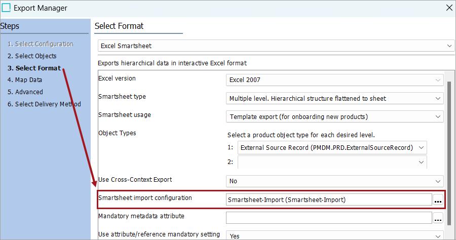 Additionally, the Smartsheet import configuration must be linked to the Smartsheet export configuration. This is done on the 'Select Format' step of the Export Manager wizard. For details, refer to the Export Manager - Select Format topic in the Data Exchange documentation.