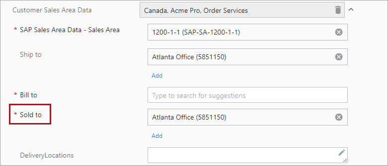 In this scenario, if the attribute ’Ship to’ is selected, values are required for the ’Bill to’ and ’Sold to’ references.