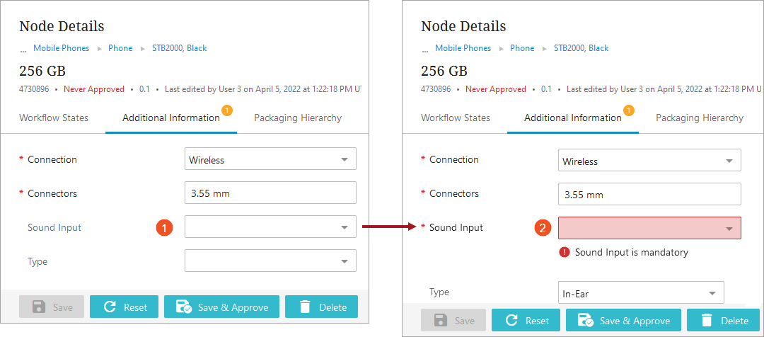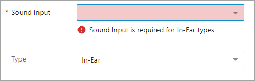 As an example, a Node Details screen is set up with a number of business conditions that apply validation to a series of attributes configured on that screen. One of those business conditions is configured to ensure that if the value of the attribute 'PrintType' is 'In-Ear,' then the attribute 'SoundInput' is set as Mandatory. If you click into the Mandatory field and click out without entering a value, you receive an error message and cannot save and continue until you have filled in the field.