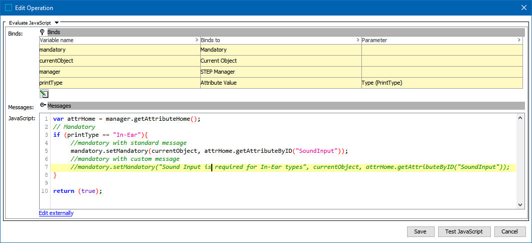 The Data Validation 'Mandatory' bind allows running a JavaScript-based business condition that sets selected attributes and references as mandatory in the Web UI. A message can also be displayed in the Web UI to give the user more information about why the object is mandatory.