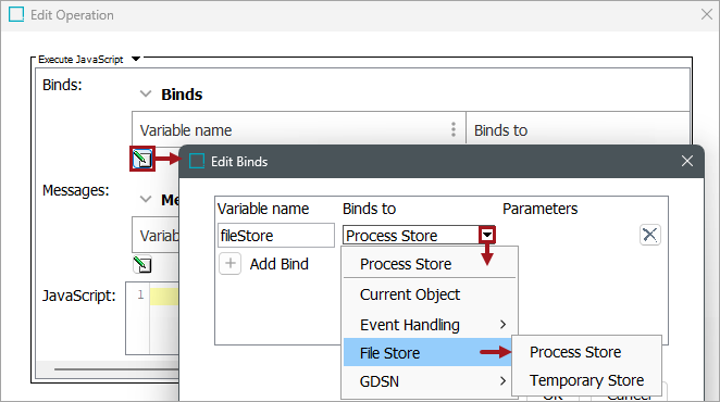 Process files, such as reports and custom format extracts required by business rules, can be created via JavaScript and are accessible with the Process Store bind.
