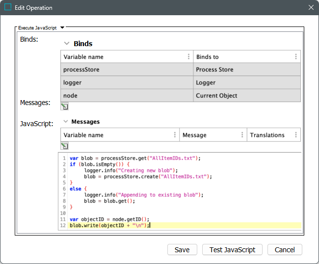 In the Edit Operation dialog, optionally add Messages, as defined in the Localized Messages for JavaScript Business Rules topic.