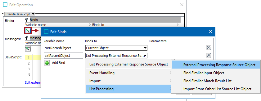 List processing configurations can use the External Processing Response Source Object to bind to a variable. For more information, refer to the List Processing External Processing Operation topic in the Data Preparation documentation.