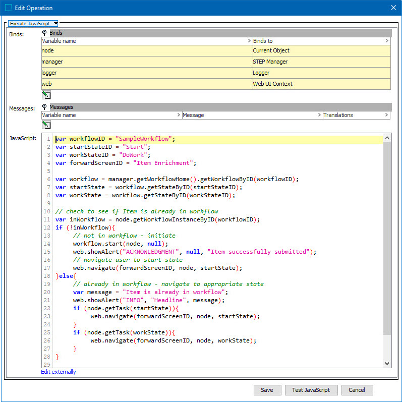 In the Edit Operation dialog, add JavaScript to call the bind.