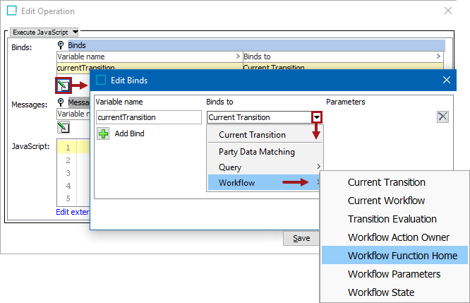 In the Edit Operation dialog, add JavaScript to call the bind.