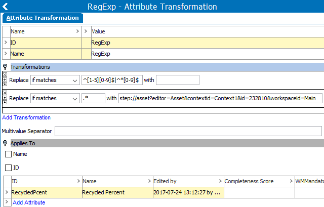 - The second regular expression transformation replaces any actual value for the 'recycled percentage' attribute after the first transformation, with the URL to an asset which is a recycling icon. Again, the STEP value is not actually altered.