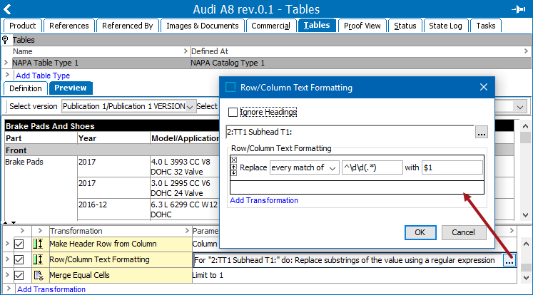 Once a table is defined in the workbench, transformations can be added on the Preview tab. The Add Transformation link gives access to many transformations, including a formatting option that uses a regular expression to modify the text.