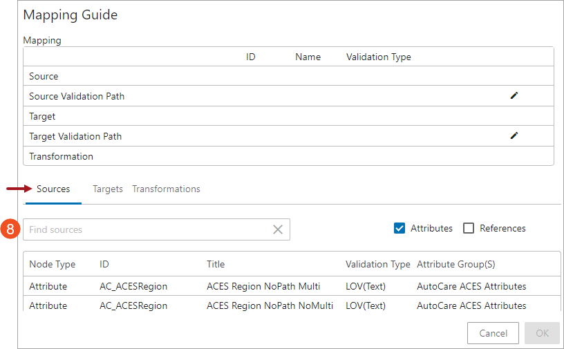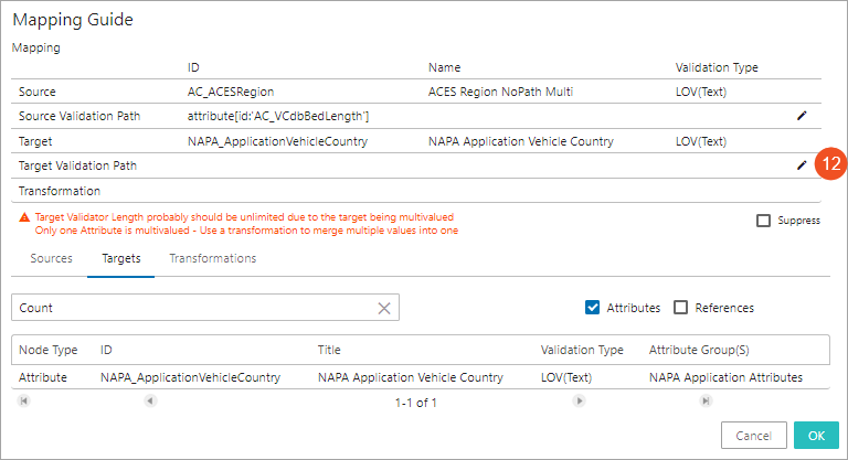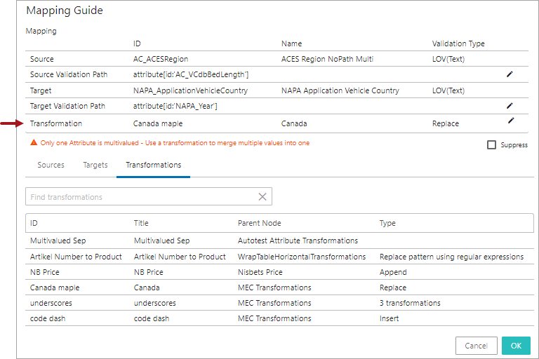 Note: Deleting an attribute transformation from the Mapping Guide window means removing it from the current mapping setup; however, editing it impacts all of the other mappings that have used the particular attribute transformation. Users are advised to be cautious before editing the attribute transformation. The Mapping Guide in the Web UI does not analyze if the transformation is applied to any other mapping.