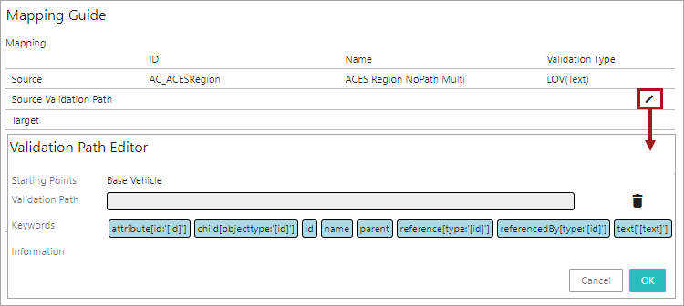 1. Optionally, if the retrieved information from the source object needs to be populated in the specific data points of the target object, click on the Edit icon () in the Target Validation Path field, and the Validation Path Editor window will display(as shown below). If the user does not want to retrieve additional information, skip populating the Target Validation Path field and proceed with step 13 of this topic.