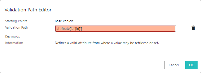 1. Double click on the required element(s) from the Keywords field. The selected element will be populated in the Validation Path field (as shown below). The specific combinations of elements are chosen depending on the unique requirements for the data being retrieved. Selecting the elements will define the source STEP Path, which describes the path from which the source data must be retrieved. Depending on the element that is selected, further configurations may be required. In the example below, element attribute[id:'[id]'] is selected and displayed in the Validation Path field. The red colored field indicates that additional configuration is required.