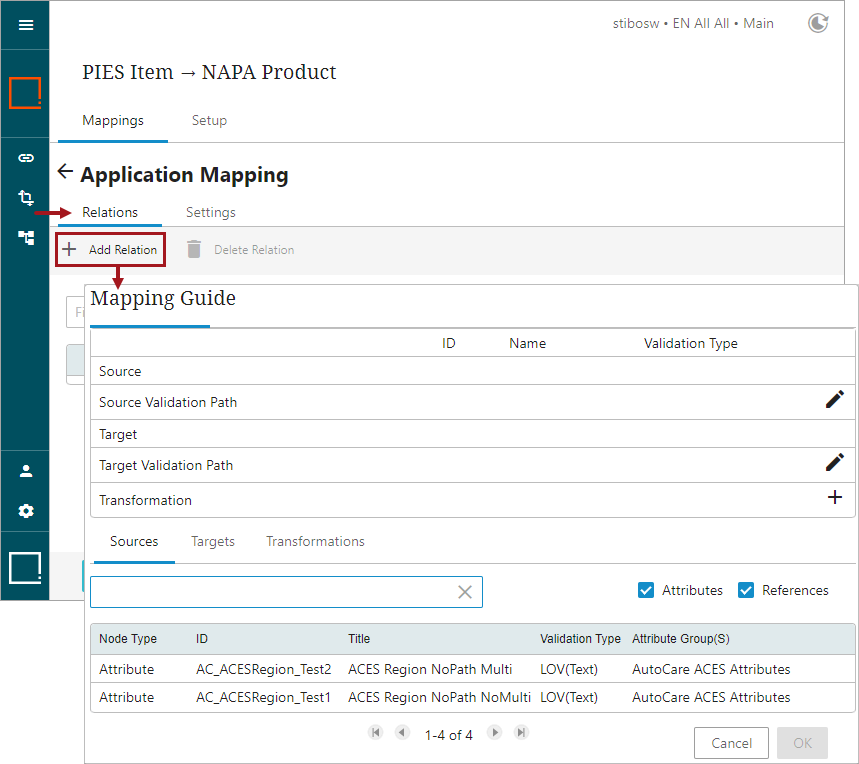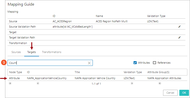 For example, suppose the source object is PIES Item and applications belonging to this source object need to be mapped to target object 'NAPA Product.' In that case, the reference type for vehicle relationship is referenced from source object vehicle = Base Vehicle to target object vehicle = NAPA Year.