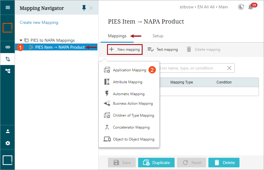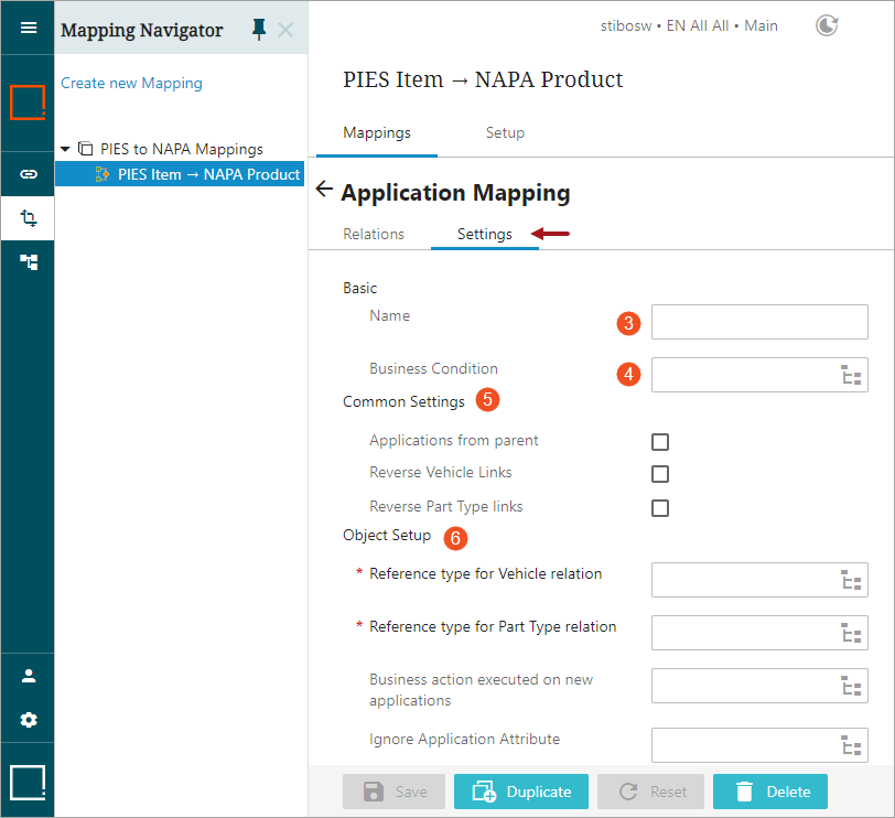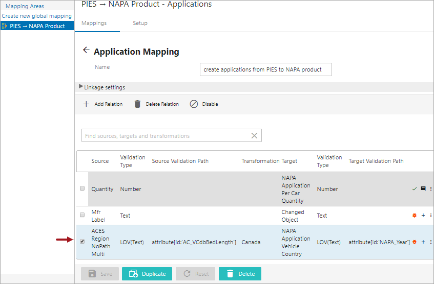 For example, if the source object is PIES Item and applications belonging to this source object need to be mapped to target object 'NAPA Product,' ,then the reference type for part type relationship is referenced from source object part type 'AutoCare Part Terminology' to target object part type 'NAPA MPCC.'