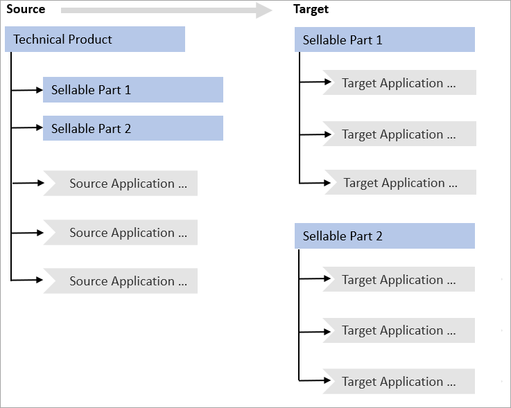 Below is an example of such a use case where the sellable parts which inherit all relevant technical product information are modeled to reside as children of the 'Technical Product' ('Technical Product' is an object where all technicalities of a product are maintained). The 'Technical Product' object is applicated, and all application records created therefore become the siblings of the sellable parts. When the application records from the source are onboarded with the 'Applications from parent' parameter selected, the application records are created below the target sellable part (as shown below).