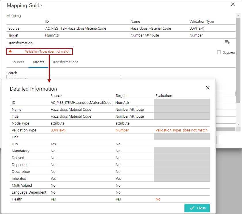 After the source and target attributes are defined, the system evaluates the validity match between the source and the target attributes. A hyperlink text explaining the reason for the validity match / mismatch gets displayed. Clicking on the hyperlink will open the 'Detailed Information' dialog and displays the validity match / mismatch information of the attribute mapping. Below is an example of a validation mismatch between the source and the target attribute displayed in the 'Detailed Information' dialog: