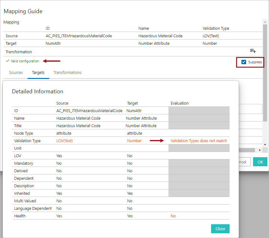 The user can suppress the validation mismatch warning message by clicking on the 'Suppress' checkbox in the Mapping Guide window. Selecting the 'Suppress' checkbox will only remove the data type mismatch warnings displayed on the Mapping Guide window and does not resolve the mismatch irregularities.