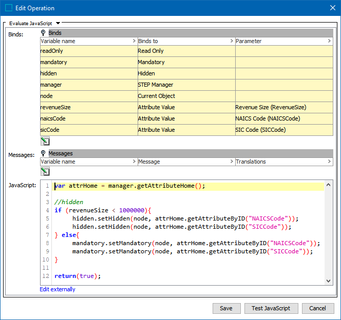 For suppliers, the Revenue Size attribute value determines the requirement for the NAICS Code and SIC Code attributes. This can be configured with the Hidden and Mandatory JavaScript binds.