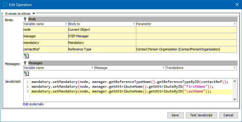 In the configuration example below, the Mandatory JavaScript bind is used designate which attributes and references are mandatory.