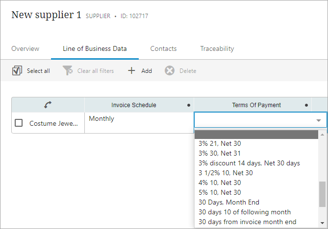 Since the list of payment term values can be lengthy, it is important to ensure that Brianna (or other sales users) can easily find and select the proper payment term for their onboarding task. In STEP, LOV Cross Validation may be used to validate the relevant list of values for payment terms against the invoice schedule attribute for the customer. For more information on LOV cross validation, refer to the Business Condition: LOV Cross-Validation topic in the Business Rules documentation.