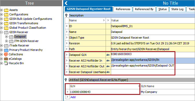 The GLN must be added to the GDSN Receiver GLN object. This GLN will be used for sending and receiving GDSN messages and must match the GLN that providers will use for publications.