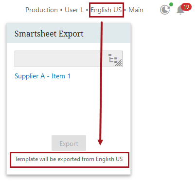 - Select the Use Current Context parameter to export the Smartsheet template from the context in which the user is currently working. Dimension-dependent headers (e.g., language-specific attribute names) will display in the sheet, and the widget itself will display a message that the template will be exported from the current context (e.g., 'Template will be exported from English US').