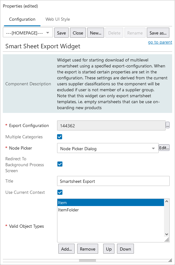 A number of configuration options are available for this widget, including options to redirect the end-user to a Background Process screen, export a template with multiple categories, configure the node picker, etc. It also has two mandatory parameters: Export Configuration and Valid Object Type.