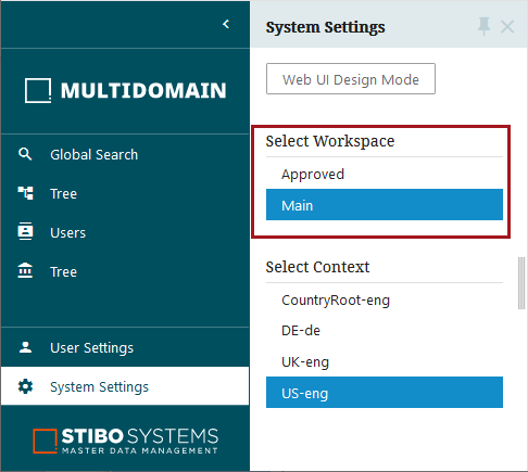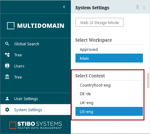 To change the context, in the Global Navigation Panel, click System Settings and select a context from the list.