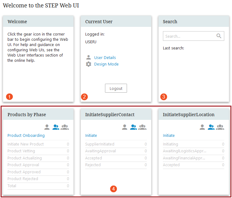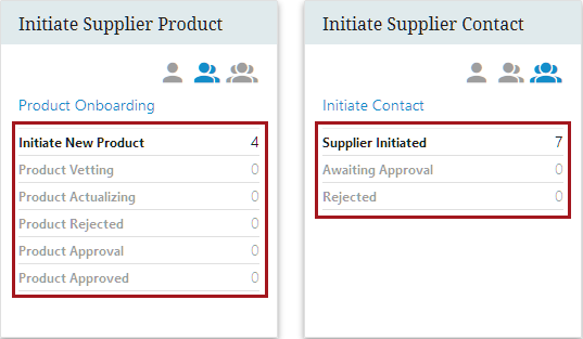 - Workflow Widgets - These configured widgets will track products or entities that have been onboarded as well as Supplier contacts and the locations.