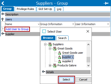- In System Setup, click the new supplier user group to display the editor.