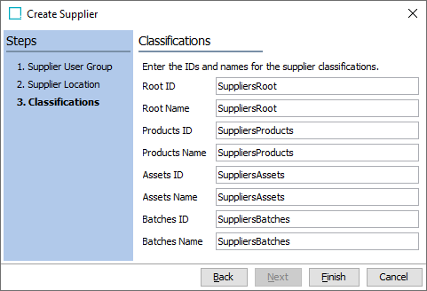 - Automatically generated IDs and names for the supplier root, product folder, entity folder, assets folder, and batches folder are displayed. However, IDs and Names can be modified as needed.