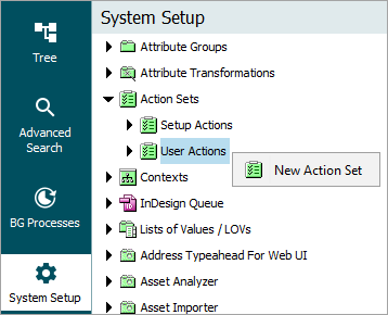 Action Sets are created below either the Action Sets > Setup Actions or the Action Sets > User Actions node.