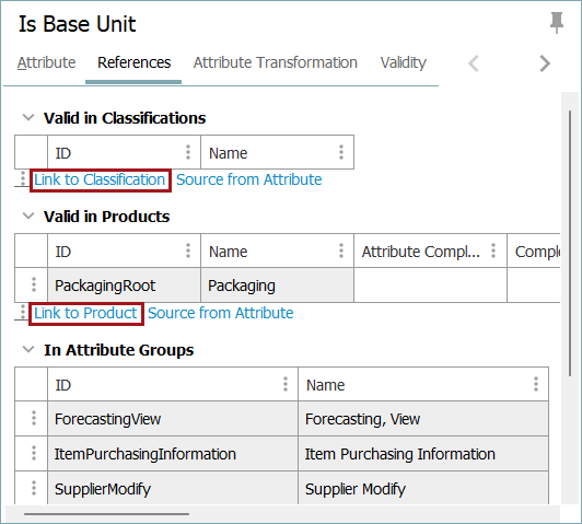 The attribute displays under Valid in Classification or under Valid in Products sections.