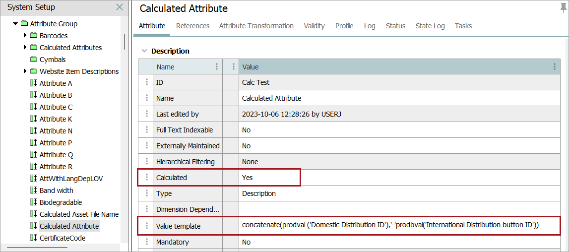 Calculated attributes are a special type of attributes whose values are not written in the database but are calculated on the fly. Calculated values are dynamic based on the context, version, product selected in the GUI or included in the export. Calculated values are generated when clicking on the object in GUI or when exported and are not stored in the database. The foundation for a calculated attribute is a functional programming language very similar to the language used for defining functions in Excel.