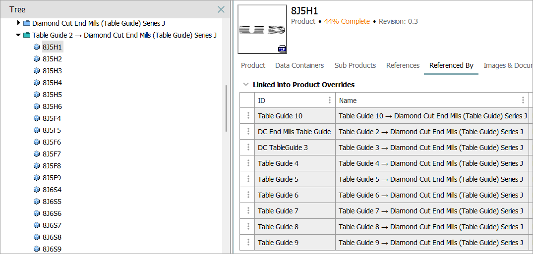 A calculated attribute on the originating product can list the names of the products that are overriding it. In this example, 'Diamond Cut End Mills (Table Guide) Series J' has multiple overrides.