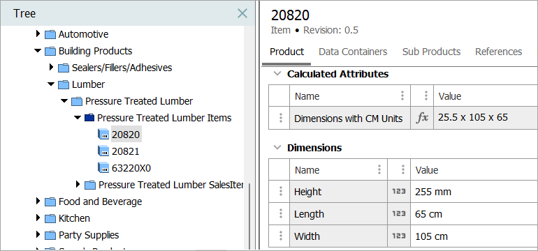 A calculated attribute can show multiple unit values using a single unit of measure. In this example, a product has several attributes with units, but the values entered are not using the same unit, the values of attributes height, length, and width have valid unit types of MM and CM.