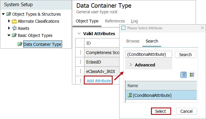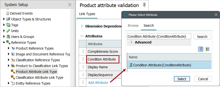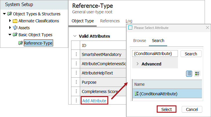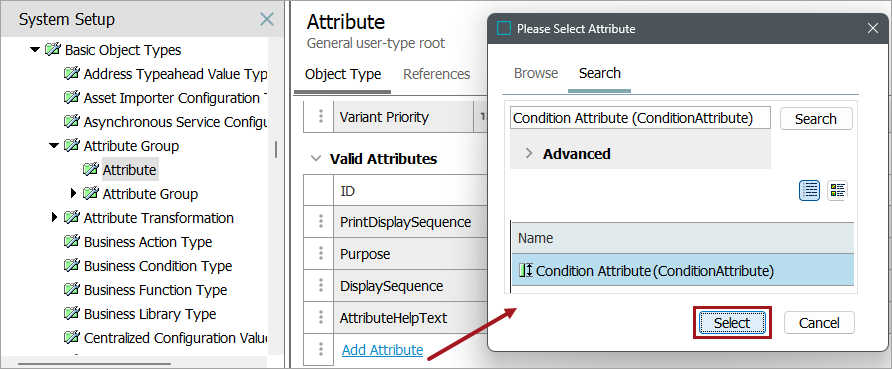 In the Valid Attributes section of the Object Type tab, click Add Attribute and browse or search for the conditional attribute from the list.