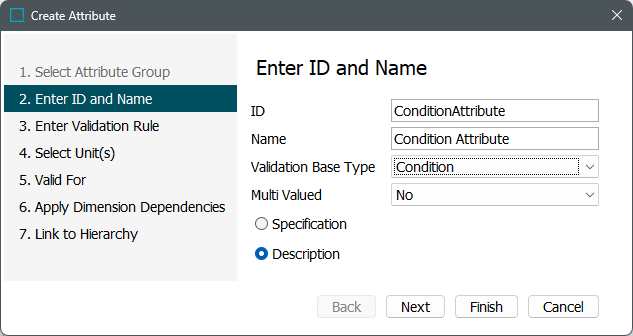 Where and how you configure a condition for an attribute depends on whether it is a description or specification attribute.