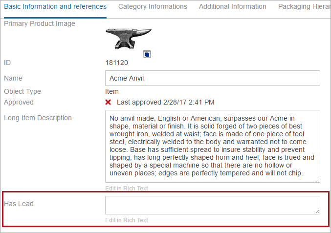 For example, the 'Hazmat' attribute is available when 'Has Lead' is set to 'Yes', but is unavailable when 'Has Lead' is left unpopulated or set to 'No'.